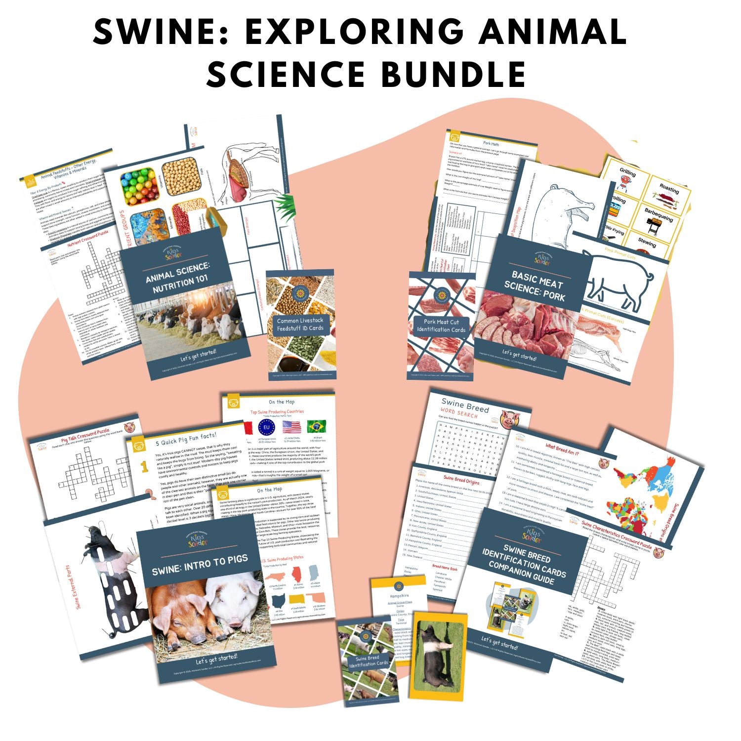 The Swine: Exploring Animal Science Bundle introduces learners ages 9–13 to the world of pigs and their essential role in agriculture. Designed around the Explore → Apply → Connect framework, this bundle helps kids build understanding step by step—first discovering the history of swine, terminology, facts, and breeds, then their purpose, external anatomy, nutrition, and composition, and finally how they connect to our food systems through production and meat science.
